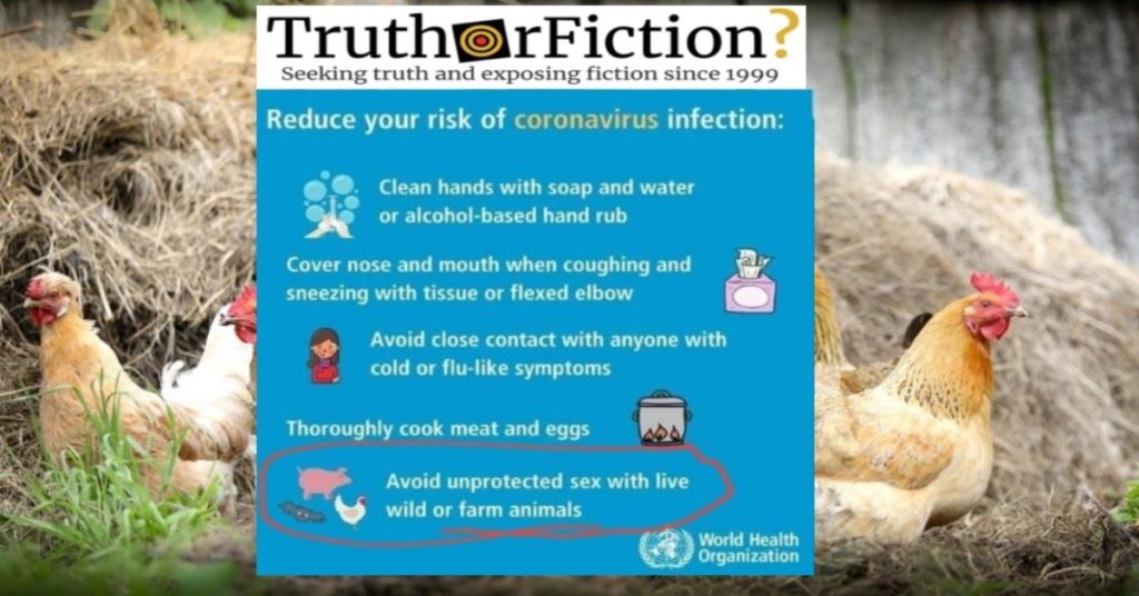 Perhaps predictably given the intended audience, the hoax graphic twists that line into “avoid unprotected sex with live, wild or farm animals”: